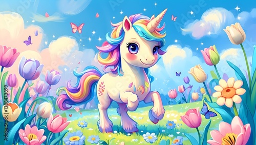 Colorful Unicorn with Rainbow Mane in a Flower Field Under a Bright Sky