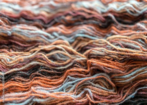 colorful, variegated, bright wool yarn fragments, knitting and handicraft concept