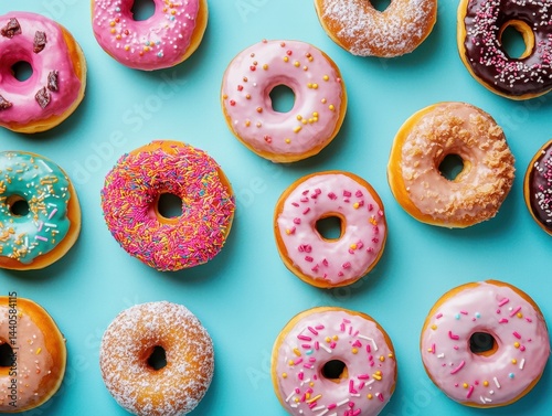 Colorful Variety of Delicious Donuts with Frosting and Sprinkles Laid Out on Bright Turquoise Background for Sweet Treat Photography
