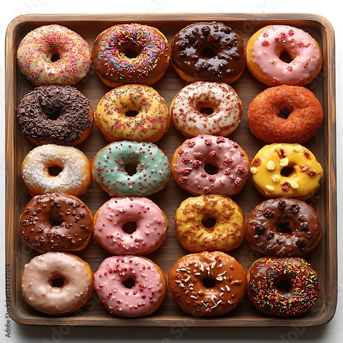 Colorful Variety of Donuts on Wooden Tray with Depth and Shadow