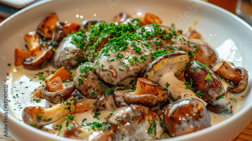 Colorful variety of fresh mushrooms in a creamy mushroom soup