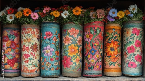 Colorful vases adorned with floral patterns, filled with vibrant flowers.