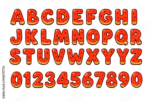 Colorful vector flat illustration of strawberry-themed letters and numbers for fun educational activities