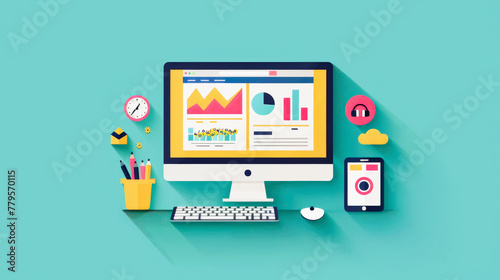 Colorful vector illustration of a desktop workspace with computer displaying graphs, surrounded by office stationery and icons.