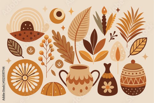 Colorful vector illustration of autumn leaves, plants, and decorative elements arranged in a harmonious composition