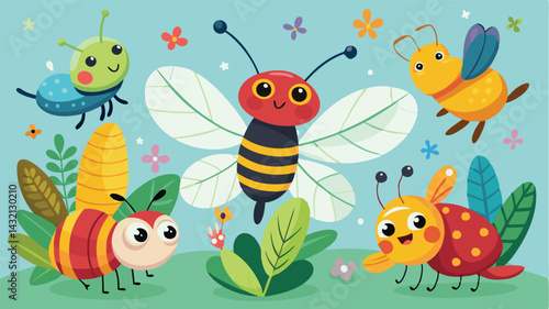 Colorful vector illustration of cheerful insects in a vibrant garden filled with flowers, showcasing a friendly bee, ladybug, and playful butterflies