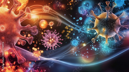 Colorful vector illustration of various viruses under a microscope, showcasing intricate details and textures against a bright and engaging background, emphasizing the diversity of viral structures