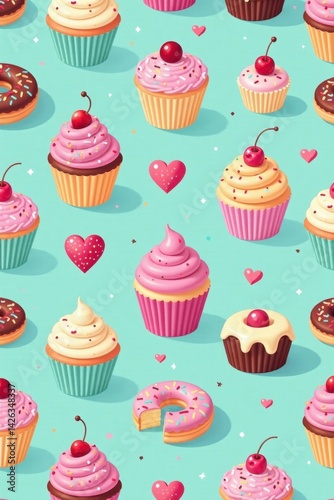 Colorful vector seamless pattern of assorted cupcakes and donuts in pastel hues, donuts, food
