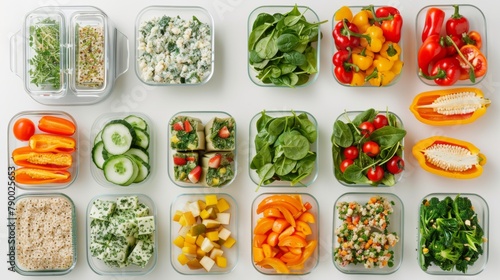 Colorful Vegan Meal Prep Setup with Stuffed Peppers and Salads