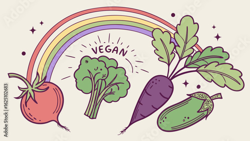 Colorful Vegan Vegetable Illustration: Tomato, Broccoli, Eggplant & Beet Healthy Food Art