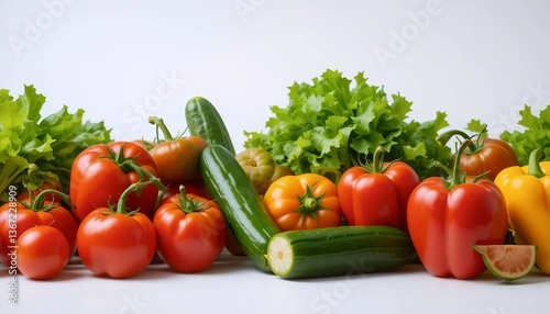 Colorful vegetables and fruits vegan food in rainbow colors isolated on white