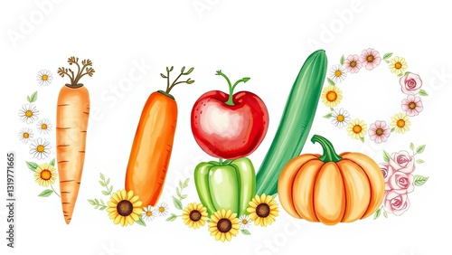 Colorful Vegetables Flowers Illustration Farm Fresh Produce Harvest Garden Food Healthy Eating Cute