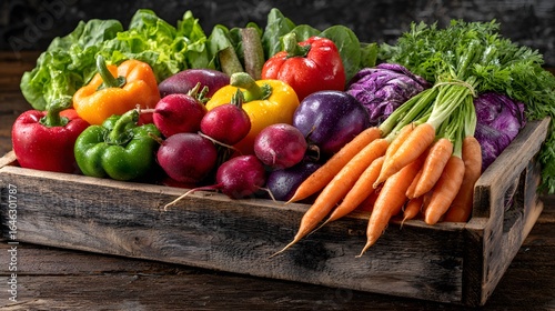 Colorful vegetables in a wooden crate.