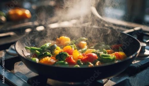 Colorful vegetables sizzling in a hot pan, steam rising (2)