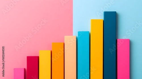 Colorful vertical bars in varying heights form a modern bar chart against a split pink and blue background.