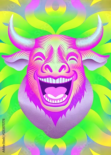 Colorful Vibrant Cow Artwork Smiling Expression Psychedelic Design Graphic Illustration