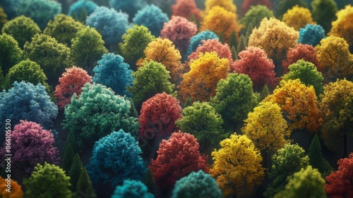 Colorful vibrant forest, unreal trees, surreal landscape illustration. Concept of imagination, fantasy, dream, vibrant colors, nature