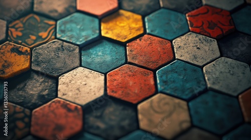 Colorful Vintage Hexagonal Tiles in a Close-Up View