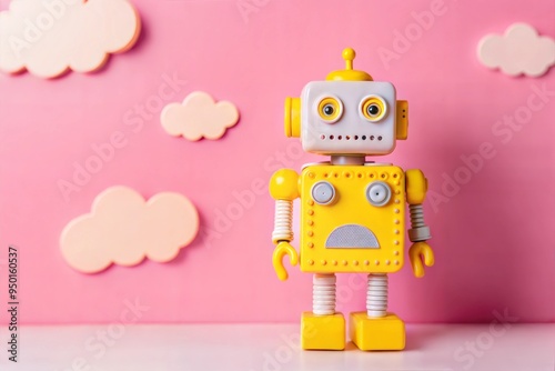 Colorful Vintage Toy Robot with Pink Background and Cloud Accents