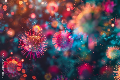 Colorful Viruses under microscope, Dangerous influenza or coronavirus cells for background