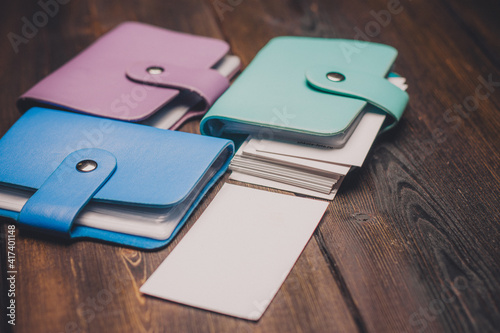 colorful wallets for business cards wooden background texture close-up