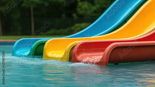 Colorful water slides in outdoor aquapark create fun and inviting atmosphere for families and children