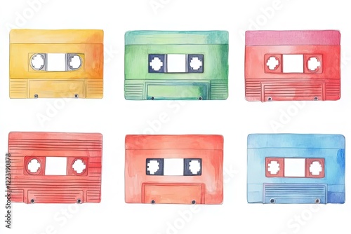 Colorful watercolor cassette tapes arranged in a creative layout, evoking nostalgia and music culture