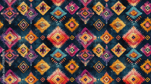 Colorful watercolor ethnic boho pattern with hand painted designs ideal for fabric swimwear and wallpaper applications