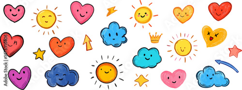 Colorful watercolor hearts and clouds. Funny cartoon hand drawn hearts, clouds. Watercolor illustration with emoji hearts and clouds