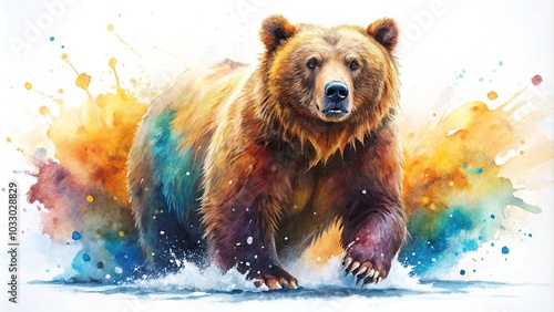 colorful watercolor painting of a brown bear with splashing paint Low Angle
