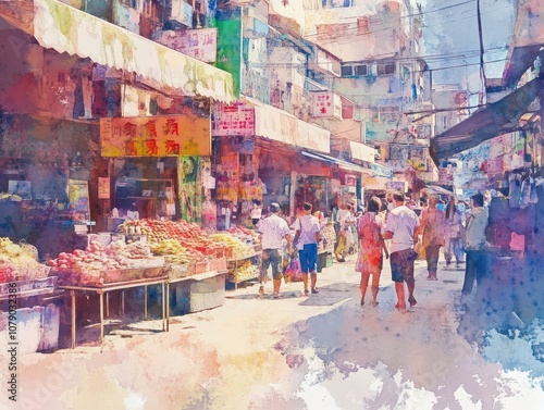 Colorful Watercolor Painting of a Busy Urban Street Scene