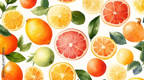 Colorful watercolor-style poster with various citrus fruits including oranges and lemons