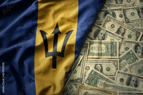 colorful waving national flag of barbados on a american dollar money background. finance concept