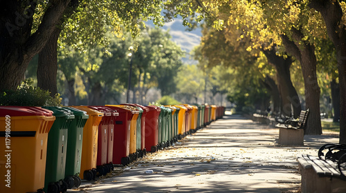 Colorful Wheelie Bins Line a Sunny Park Path with Trees and Benches
