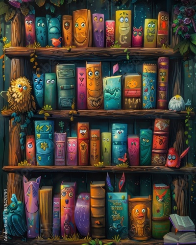Colorful, whimsical books on a shelf, featuring unique faces and vibrant designs, ideal for promoting literacy and creativity.