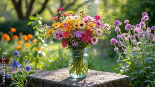 Colorful wildflower bouquet in a jar on stone table in sunlit garden