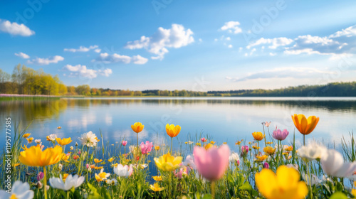 Colorful wildflowers bloom by tranquil lakeside under clear blue sky