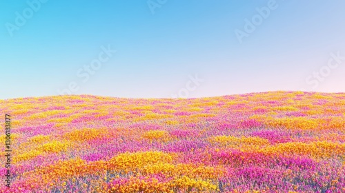 Colorful wildflowers bloom on rolling hills under a vibrant sky; idyllic spring scene for design