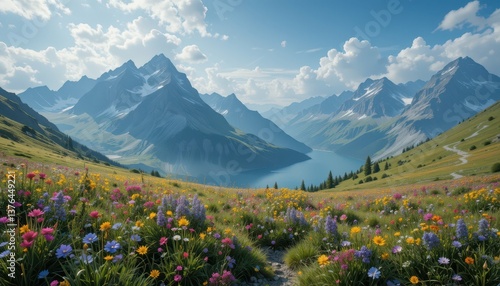 Colorful Wildflowers in Scenic Mountain View with Calm Lake