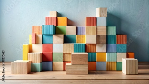 Colorful Wooden Blocks Arranged in a Creative Stack Against a Light Blue Wall