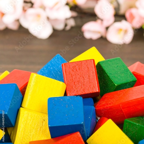 Colorful wooden blocks piled on a dark surface, blurred pink flowers in the background