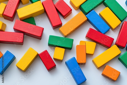Colorful wooden blocks scattered on white surface