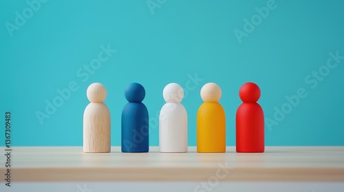 Colorful wooden figures arranged in a row against a teal background, showcasing simplicity and modern design.