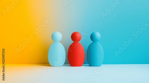Colorful wooden figures arranged on a vibrant background create a minimalist artistic display showcasing simplicity and playfulness