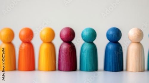 Colorful wooden figures lined up on a neutral background, celebrating diversity and inclusion