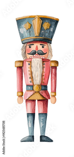 Colorful wooden nutcracker soldier figurine in traditional uniform, cut out - stock png.