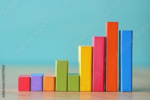 Colorful wooden toy blocks are arranged on a table, forming an upward trend against a blue background