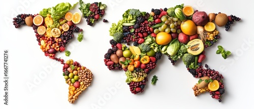Colorful world map made of fresh fruits and vegetables representing healthy diet and nutrition