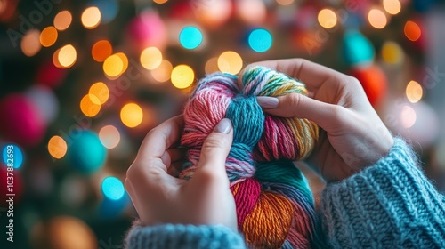 Colorful Yarn Ball in Hands with Bokeh Lights Background