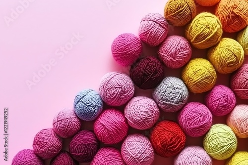 Colorful yarn balls arranged on a pink background